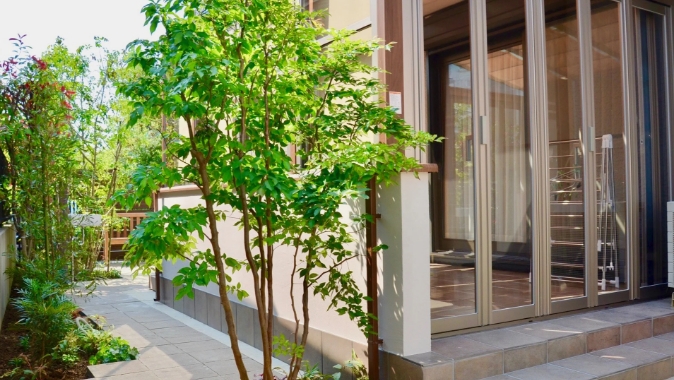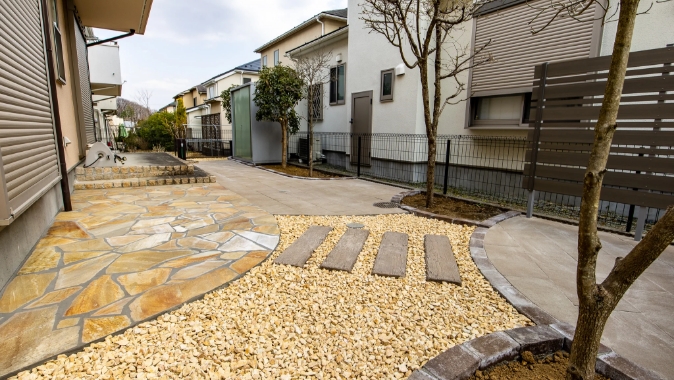 地面は石調の舗装材を敷き、雑草知らず。ご入居後、気持ちよく過ごせるお庭となりました。