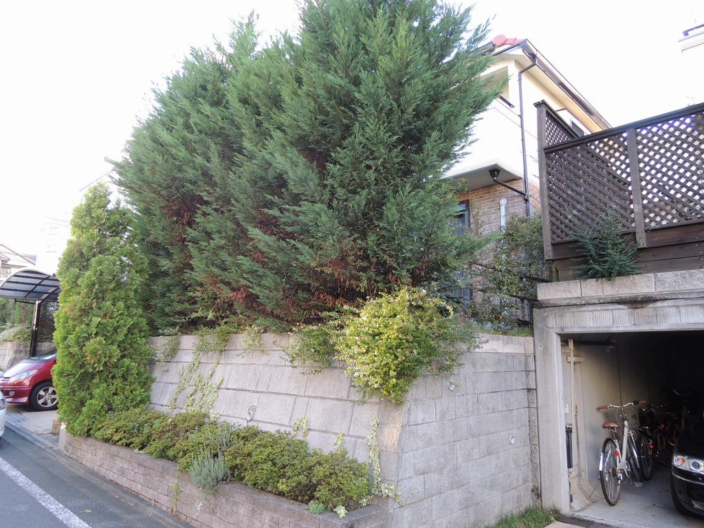 道路側に列植されたコニファー(ゴールドライダー)が高さ5m級になり、お手入れが困難な状況になっていました。また、お庭内部が日陰になってしまい、芝生も育たなくなり・・・という悪循環が生まれていました。