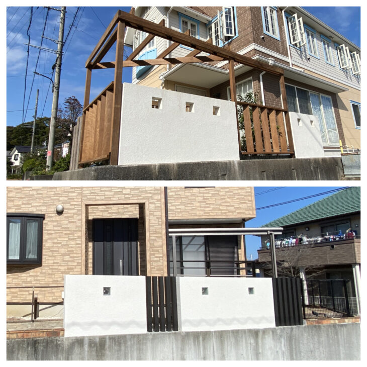 表面の仕上げは塗り壁、タイル貼りなどブロックと同様に色々なことができ、ポストや照明の埋め込みも可能です。背の高い目隠しが必要な方や、モダンな印象が好きな方におすすめです。