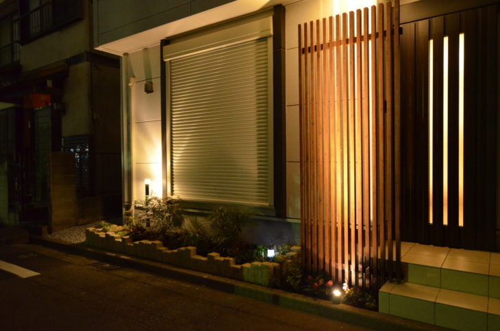 エントランスと植栽を間接照明でライトアップ。夜の帰宅時や来客の印象を格上げする外構に。照明のON/OFFは自動タイマー付きで操作も簡単。