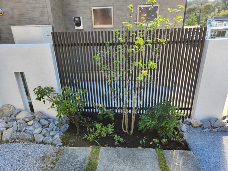 目隠しフェンスと植栽で、プライバシーと防犯性を確保。外からの視線を遮りながらも、圧迫感のないデザインに。季節感にもこだわりました。