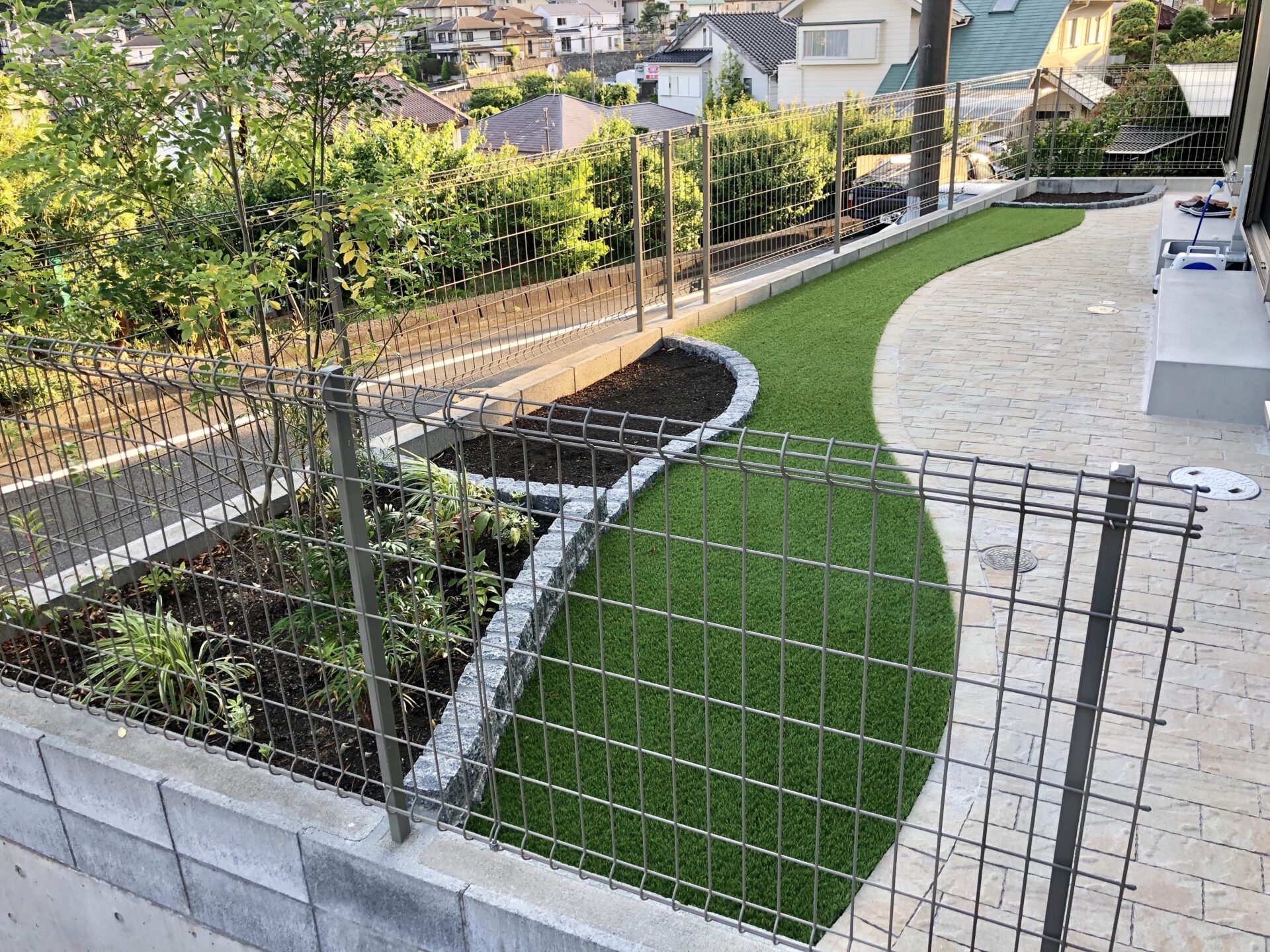 一番のお楽しみ^ ^投稿日:2019年6月11日先日完成したお庭の状況確認に伺いました。雑草だらけだった土の地面を人工芝と透水性のある舗装材に、そして手前と奥に天然石で囲った花壇スペースを。シンボルツリーや低木のメインは私どもで植栽させて頂きました。花壇の残る部分は、お客様がお花などお好きなものを植えられるフリースペースです。「何を植えようかな〜♪」と、お庭づくりで一番ワクワク楽しいところですね(^^)