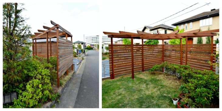 角地の目隠しでお庭のリフォーム投稿日:2021年5月7日八王子でお庭のリフォームをさせて頂いた事例です。隣が空き地で角地のような感覚、外からの視線を受ける範囲がかなり広いお庭でした。とはいえ、全面フェンスなどで囲う訳にもいかないので最も居心地良い場所をコーナーに設けつつ、大型の木製パーゴラ兼目隠しをオリジナルで施工。温かみがあって安心の、お庭のシンボル的存在に^ ^