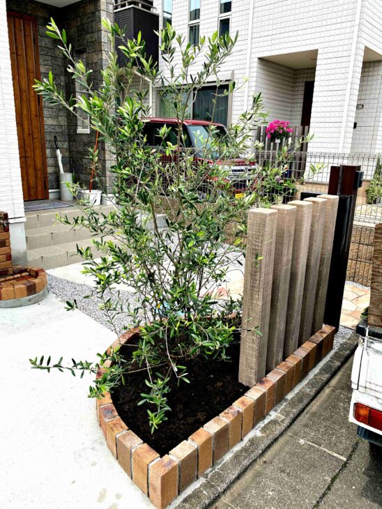 シンボルツリー祭り(笑)投稿日:2021年5月31日週末、工事の仕上げとして3軒連続でシンボルツリーを植えたのでご紹介します。まずは1軒目のオリーブ。細長い小さめの葉っぱの常緑樹で、雰囲気を南欧風に変えてくれます。 あまりカッチリ整える樹ではないので、普段は比較的管理が楽です。植えてから数年の成長はゆっくりですが、しっかり根付いた後は枝が密集しやすくなることが多いので、年1回はプロに剪定をお願いした方が良いかもしれませんね^ ^