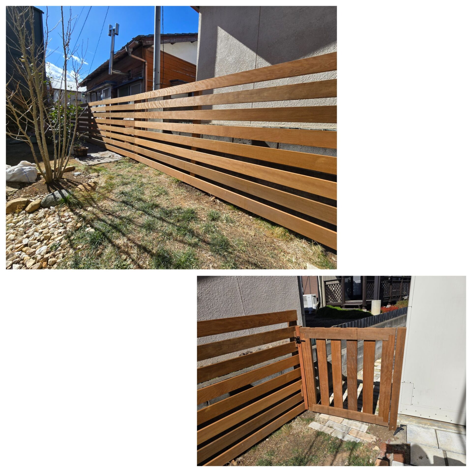 ワンちゃんを庭で放し飼いにしたい、とのご希望で、ハードウッド(イタウバ材)でフェンスと門扉を制作しました。