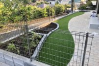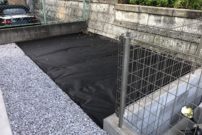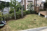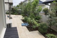先日完成したお庭の状況確認に伺いました。 雑草だらけだった土の地面を人工芝と透水性のある舗装材に、そして手前と奥に天然石で囲った花壇スペースを。 シンボルツリーや低木のメインは...