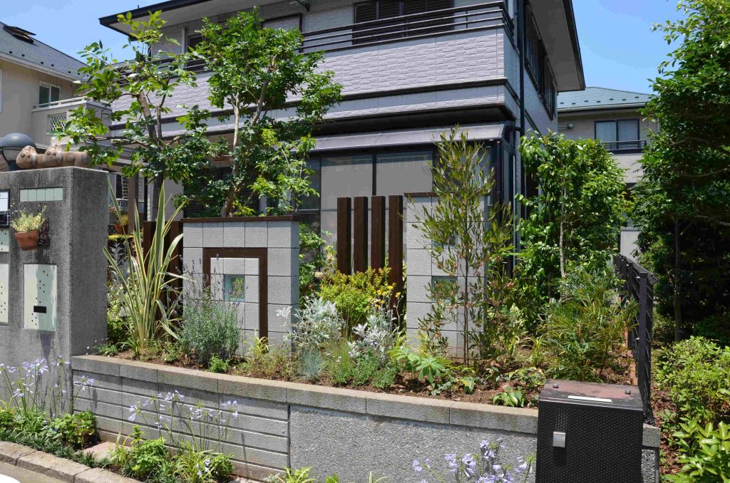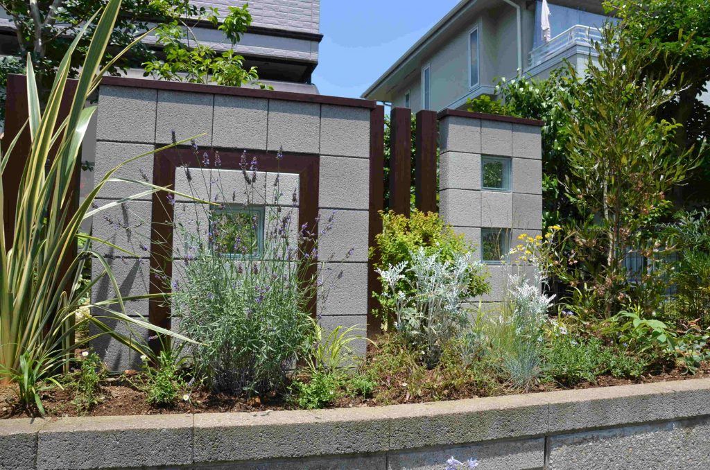 (施工後)歩道側から見て、ディスプレイされたように植物を楽しめます。植物に手を伸ばしたり、足を踏み入れたりし易いようメンテナンス性も考慮して設計しています