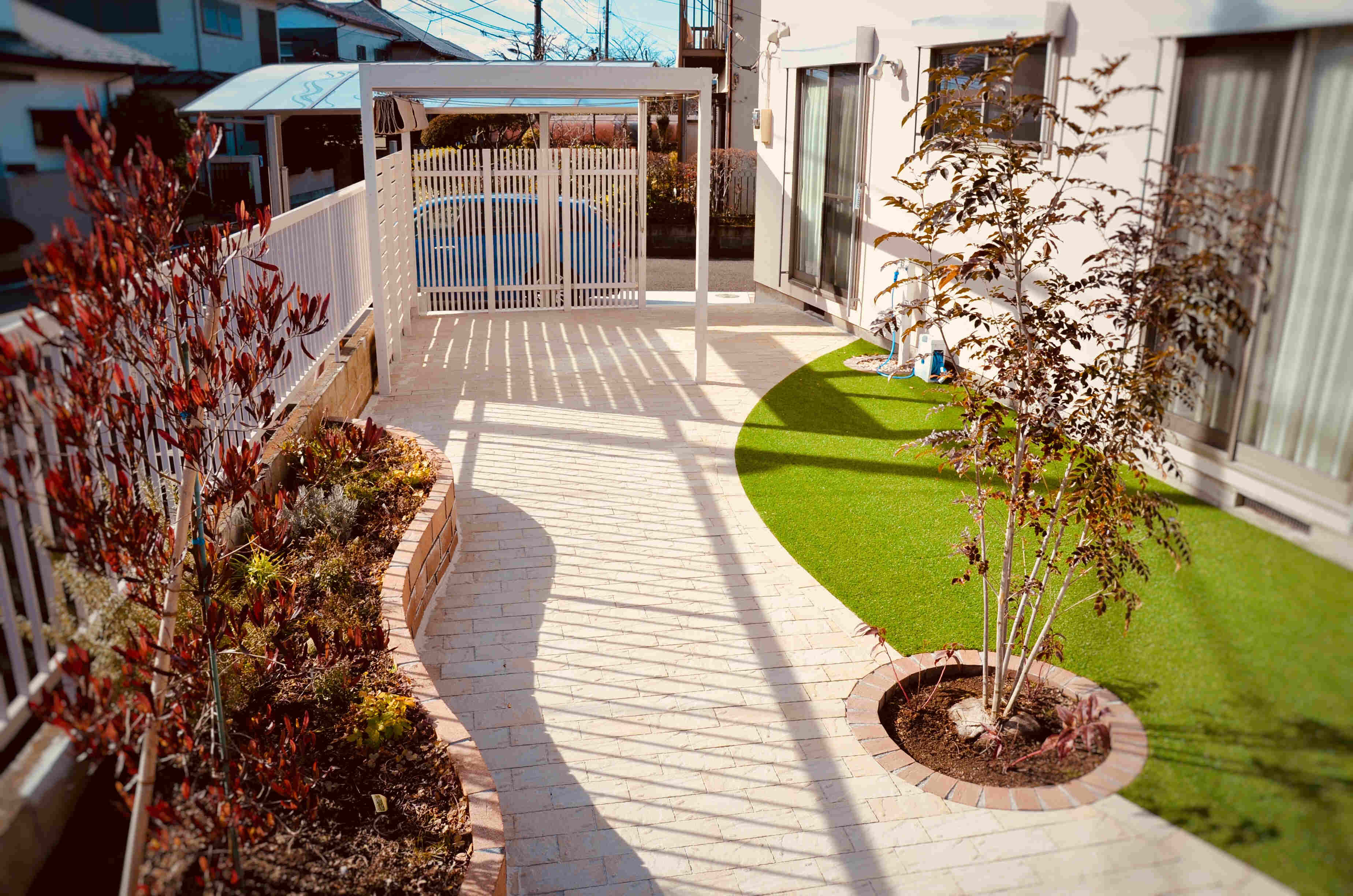 主な内容:ガーデンリフォーム エクステリア 人工芝 レンガ花壇 日除けパーゴラ 目隠しフェンス 雑草防止 カーポート 枕木門柱 植栽 既存フェンス塗装 ブロック修繕 他