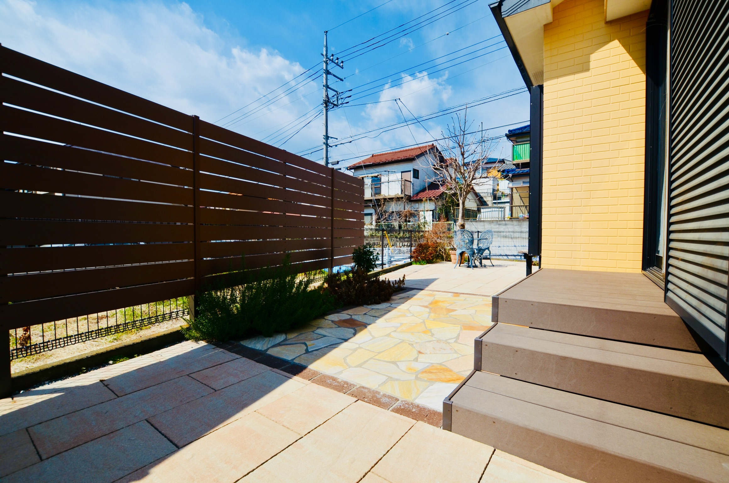 主な内容:目隠しフェンス 自然乱形石貼り ウッドデッキ 舗装材 植栽