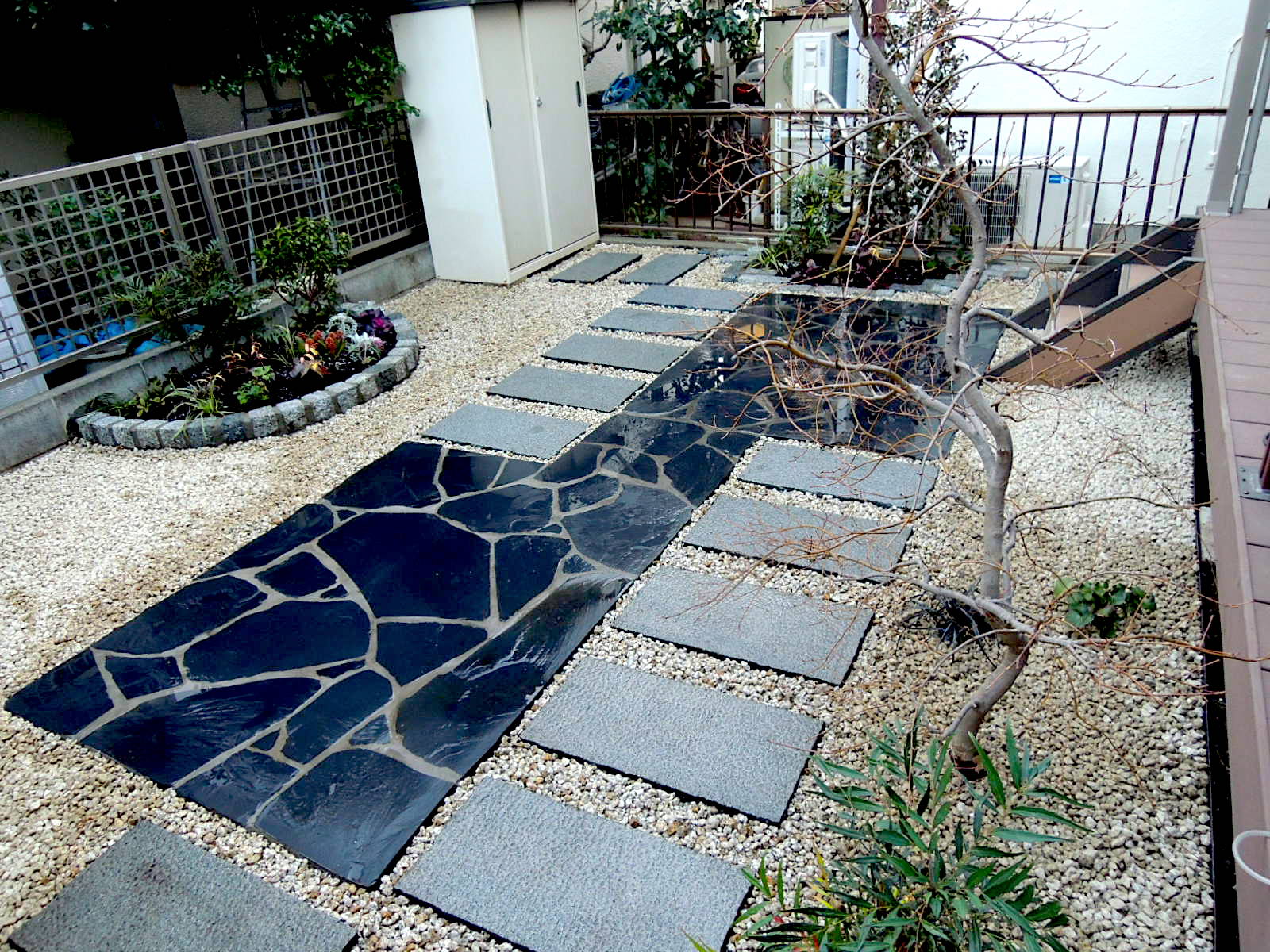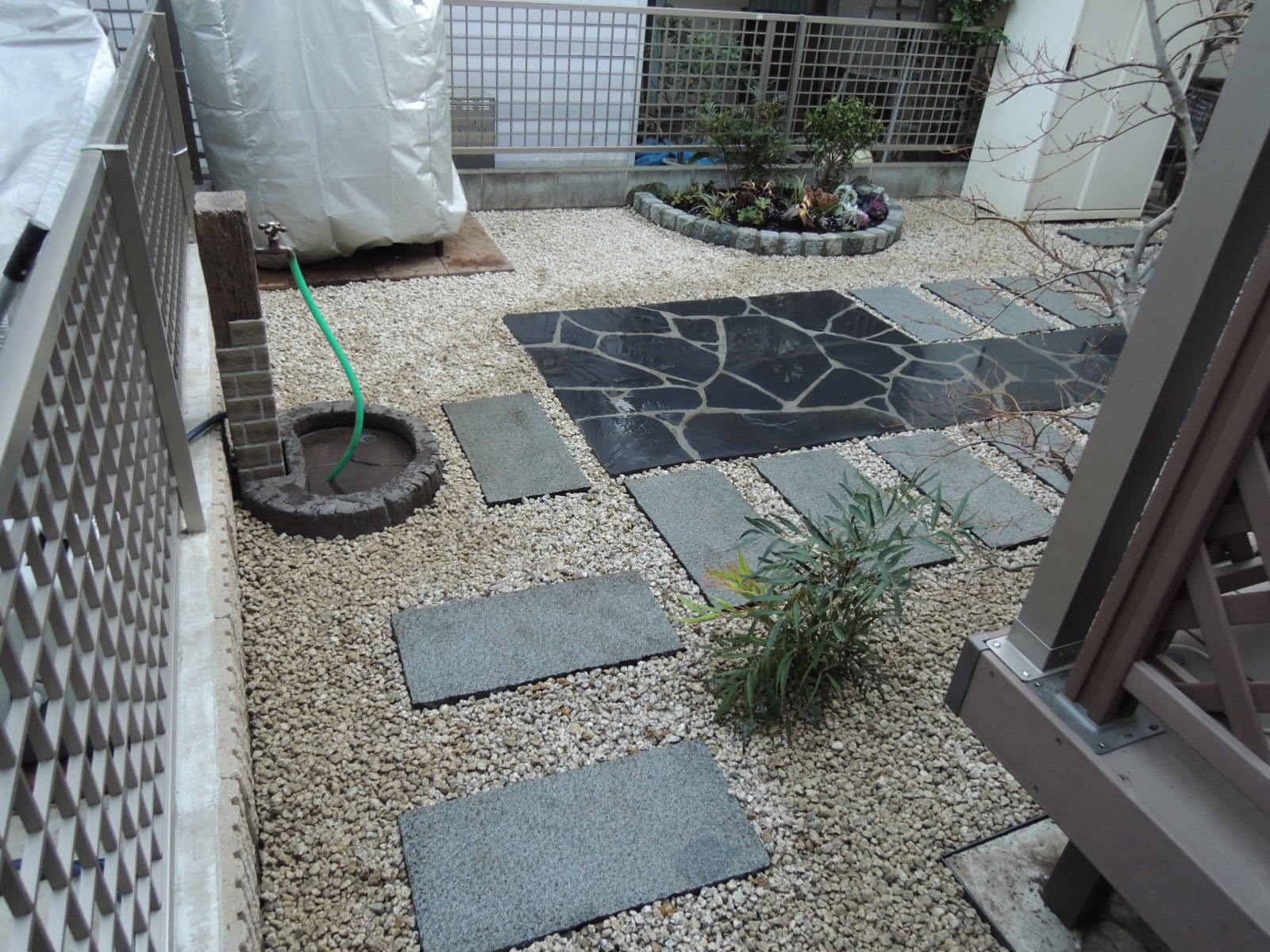 主な内容:御影敷石 自然乱形石 さび砂利 防草シート 立水栓 ピンコロ石花壇 植栽