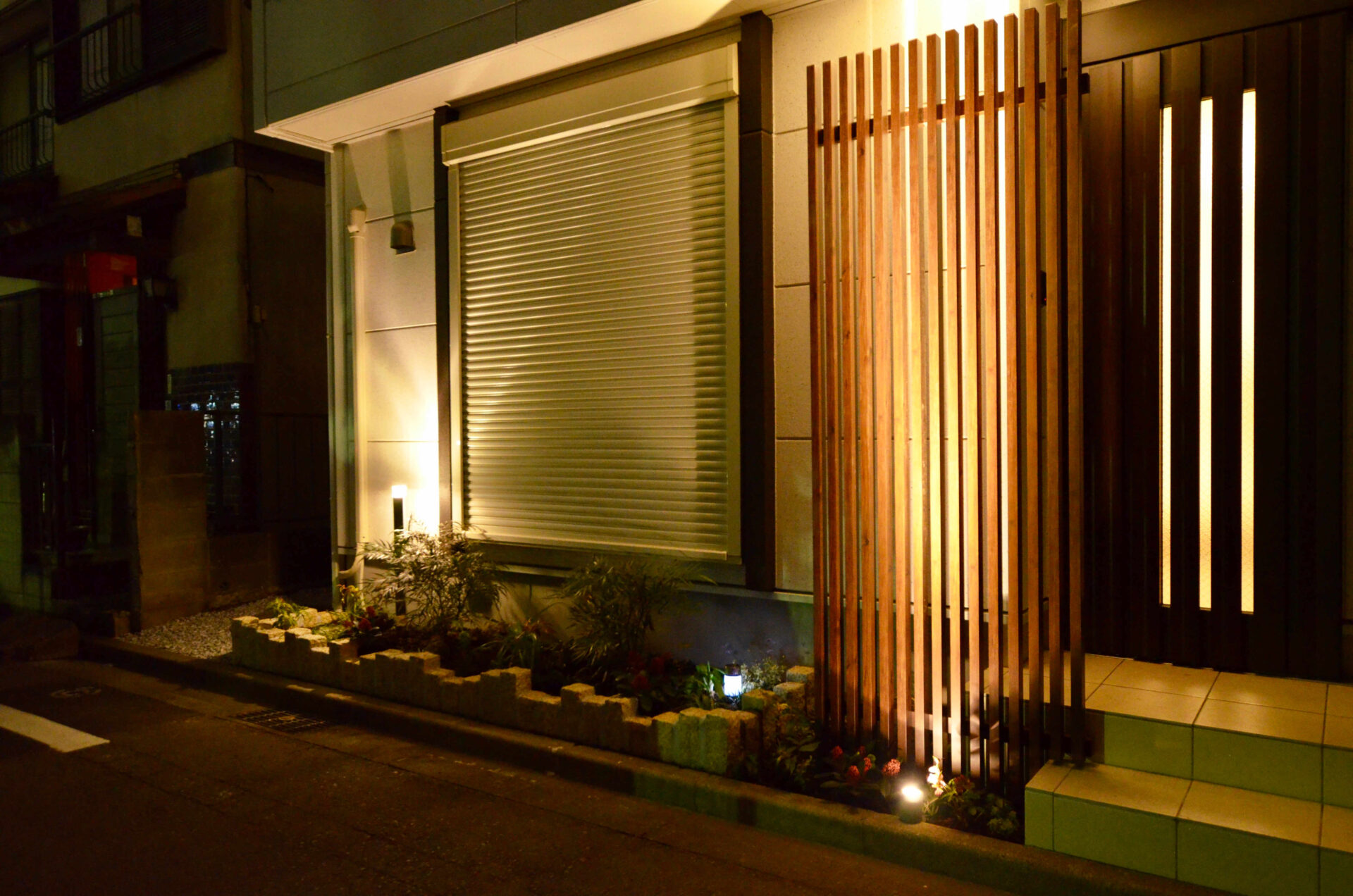 縦格子のフェンスで扉の前をスッキリと目隠し。植栽で彩りを添え、夜は照明で昼間と別の表情を演出します。