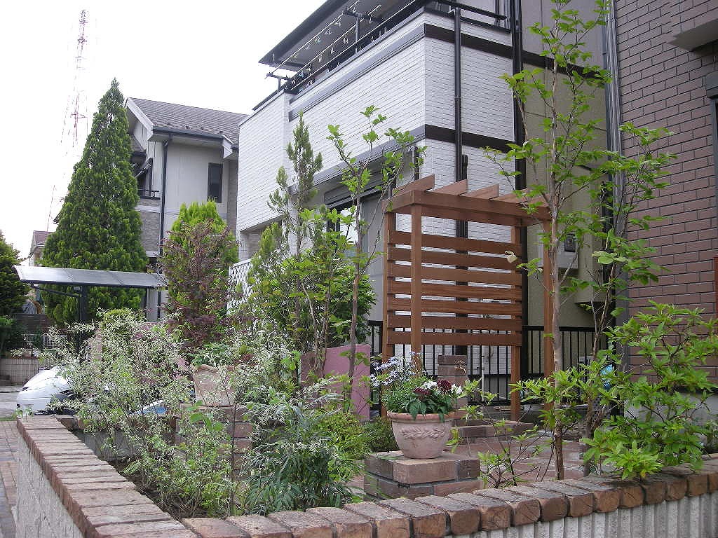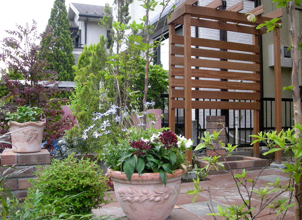 外から見て楽しめ、またお手入れの楽なお庭に。目隠しを兼ねたパーゴラやレンガの立水栓、植栽がポイントとなっています。