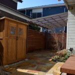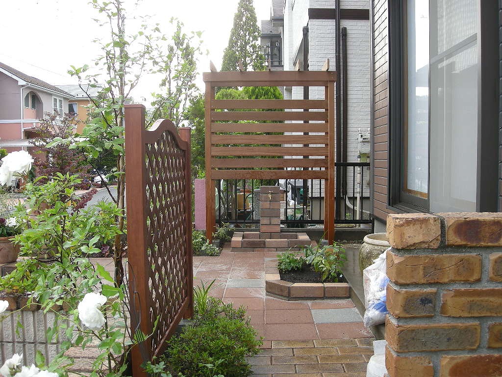 主な内容:目隠しパーゴラ(ウリン材) 舗装材 ラティスフェンス レンガ立水栓 植栽