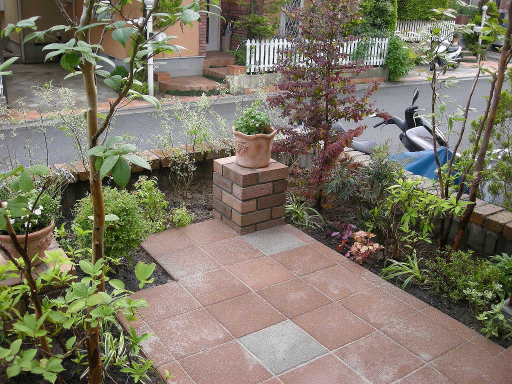 お庭としてはちょっと難しい場所・形・広さでした。外から丸見えの場所であること、玄関までの階段の途中で入っていくのでアプローチがし難い、窓を開けないお部屋に面している・・・という条件です。そこで、お客様の普段の動線から見える視線を想定して、「見て楽しめる」ことを主眼におきました。また外からも大変良く見えるので、「見られる、見せる」ことも大事に。地面は雑草が生えにくい舗装にして維持管理も楽なお庭となりました。