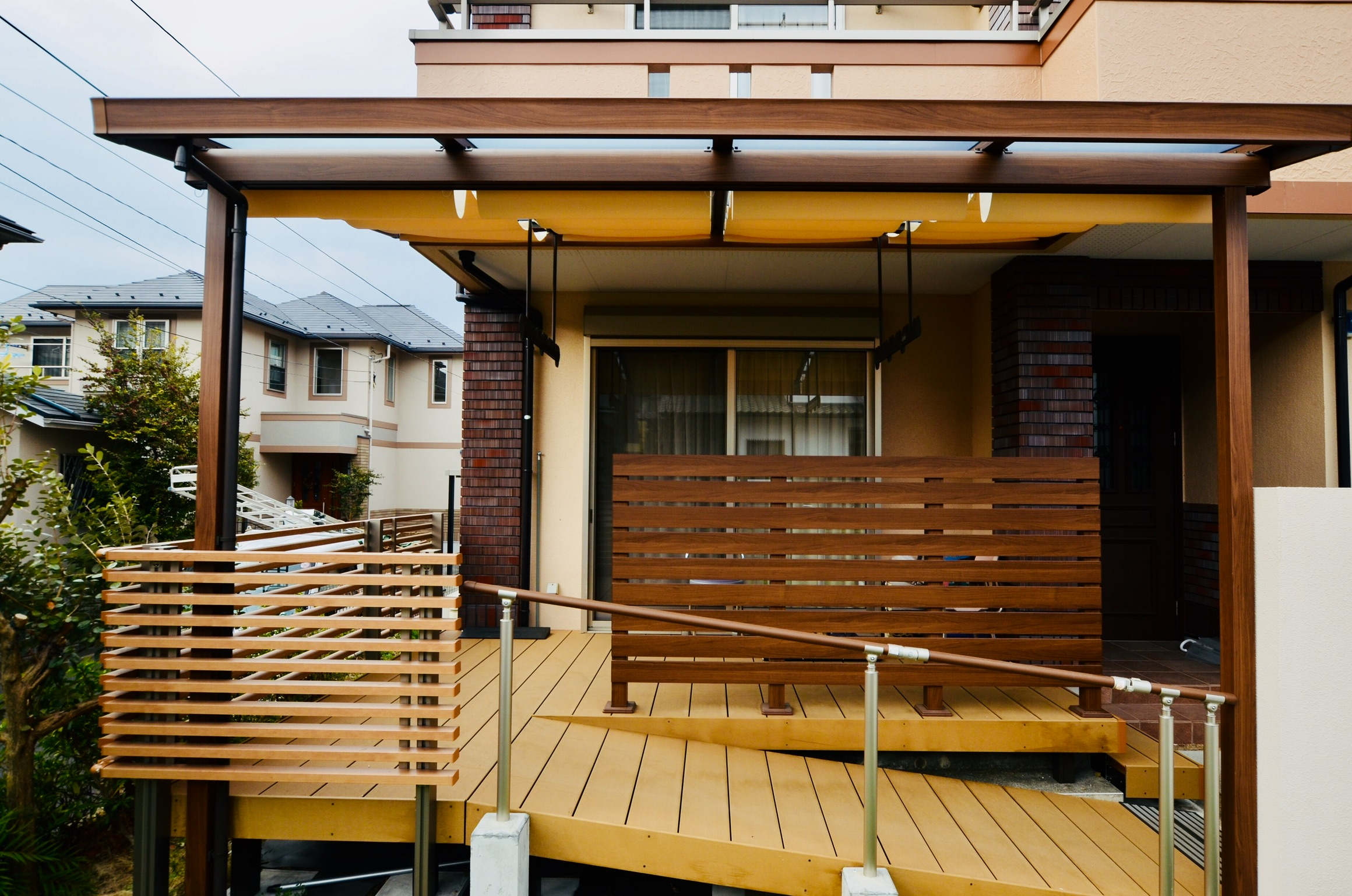 主な内容:ウッドデッキ(樹脂製) テラス屋根 日除け 目隠しフェンス 手すり