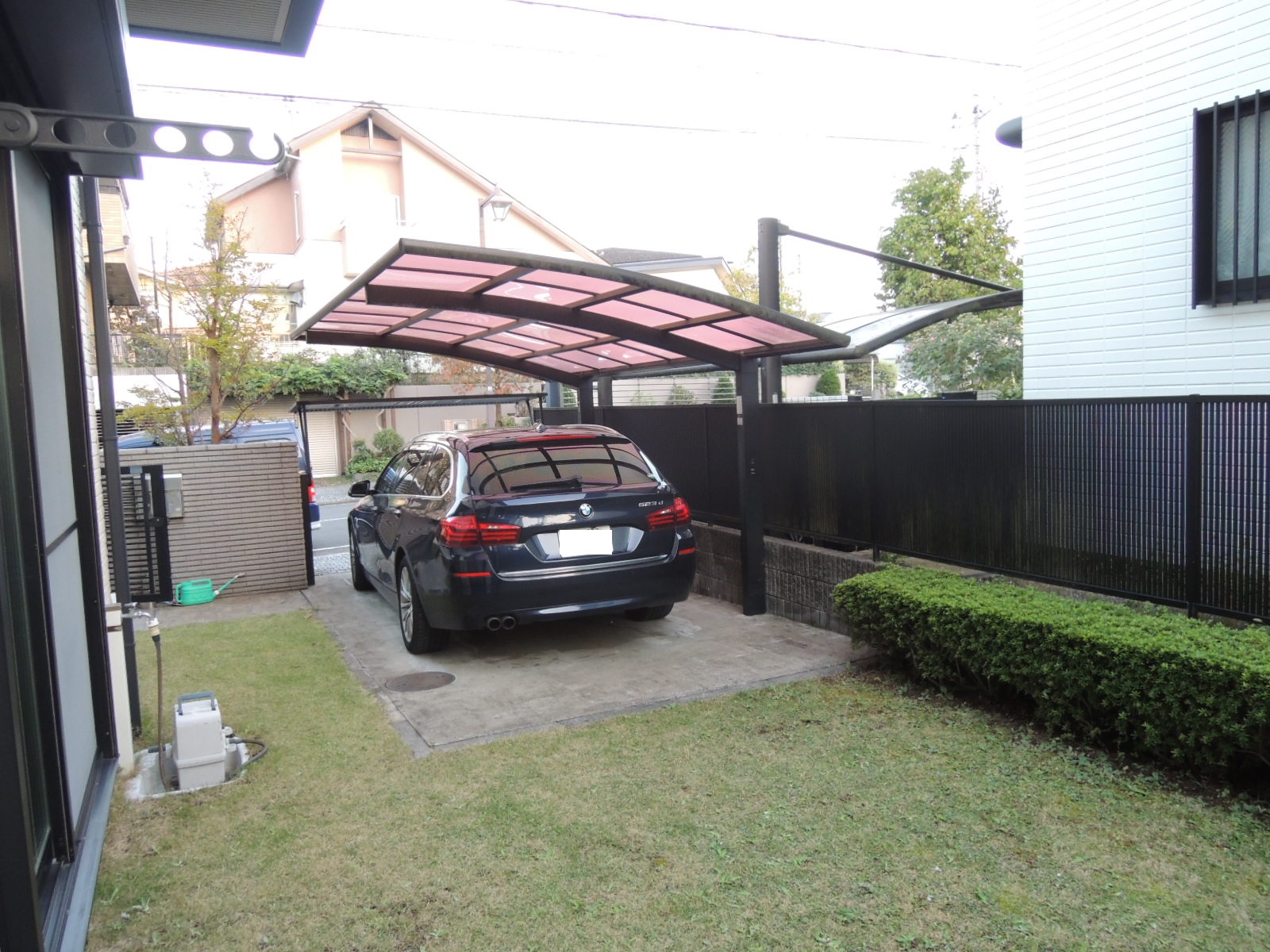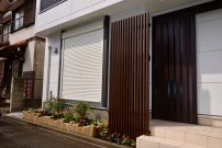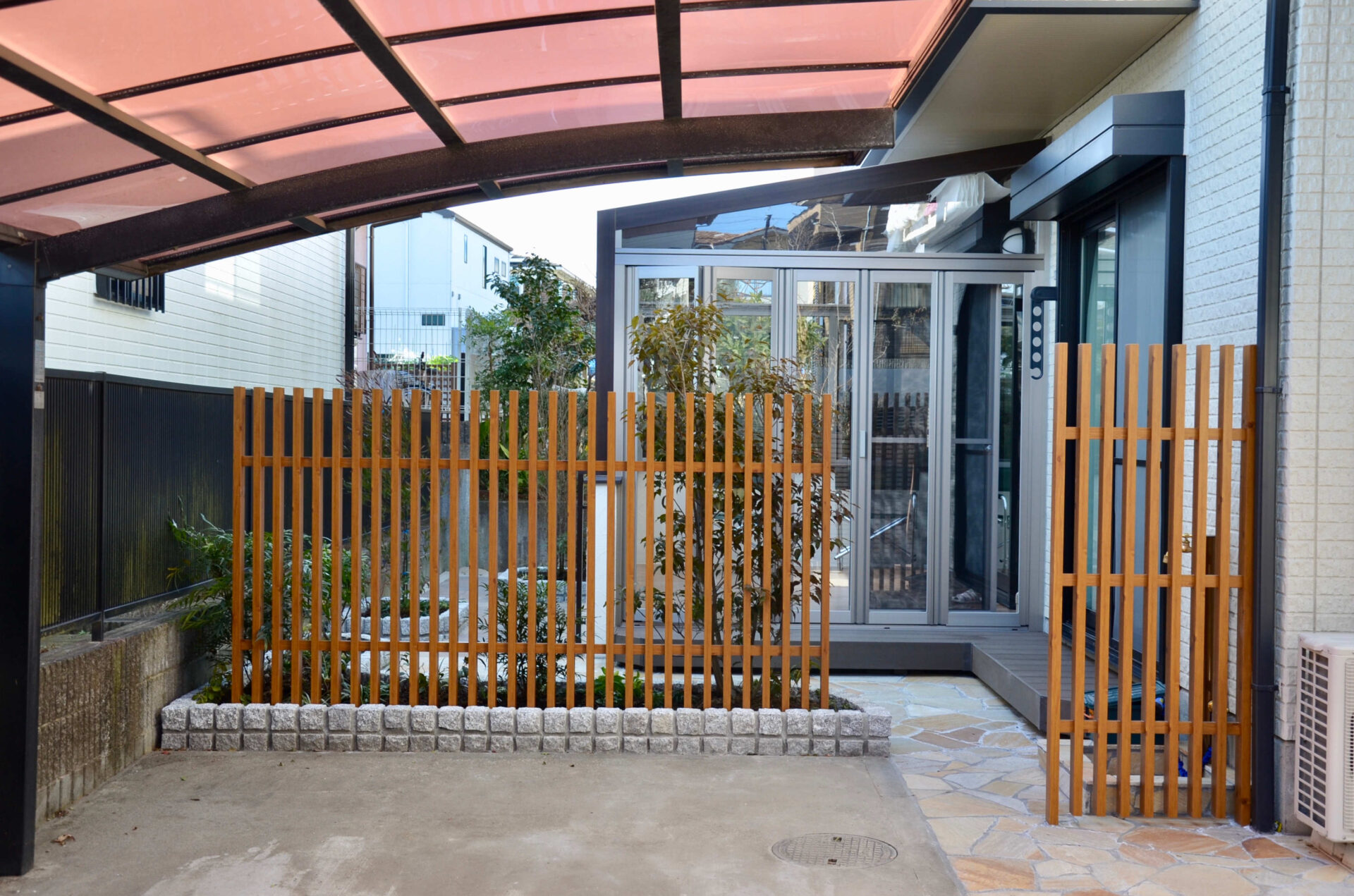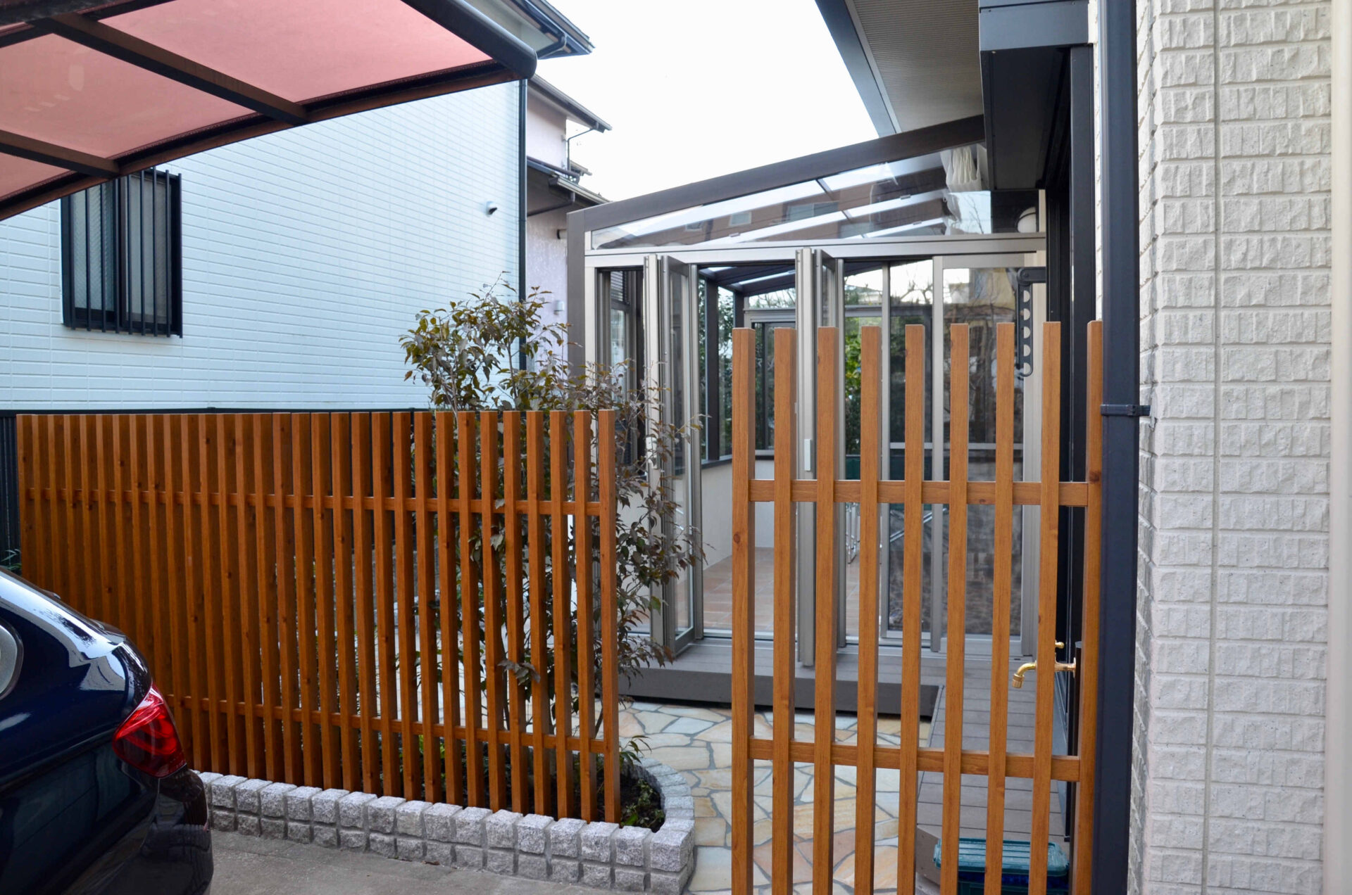 道路からガーデンルームへの視線を防ぐのと、ガーデンルームやリビングから駐車スペースが丸見えになるのを防ぐ為の目隠しです。そのような実用性と雰囲気作り、また防犯性も含めて検討し、縦格子のフェンスにてデザインさせて頂きました。道路から少し奥まった位置なので、格子間の隙間は少し広いタイプで緩めの目隠しです。道路側の手前には幅の狭い同型のフェンス(奥側より若干高い)を設置、奥行き感と家側の目隠しを補っています。