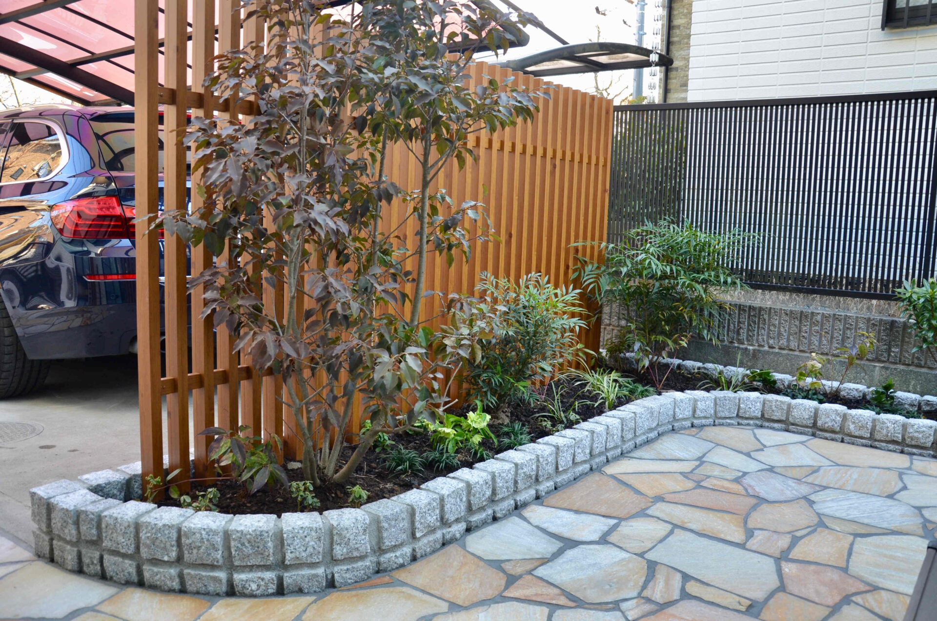 主な内容:目隠しフェンス ガーデンルーム ウッドデッキ 乱形石 花壇 植栽 舗装材
