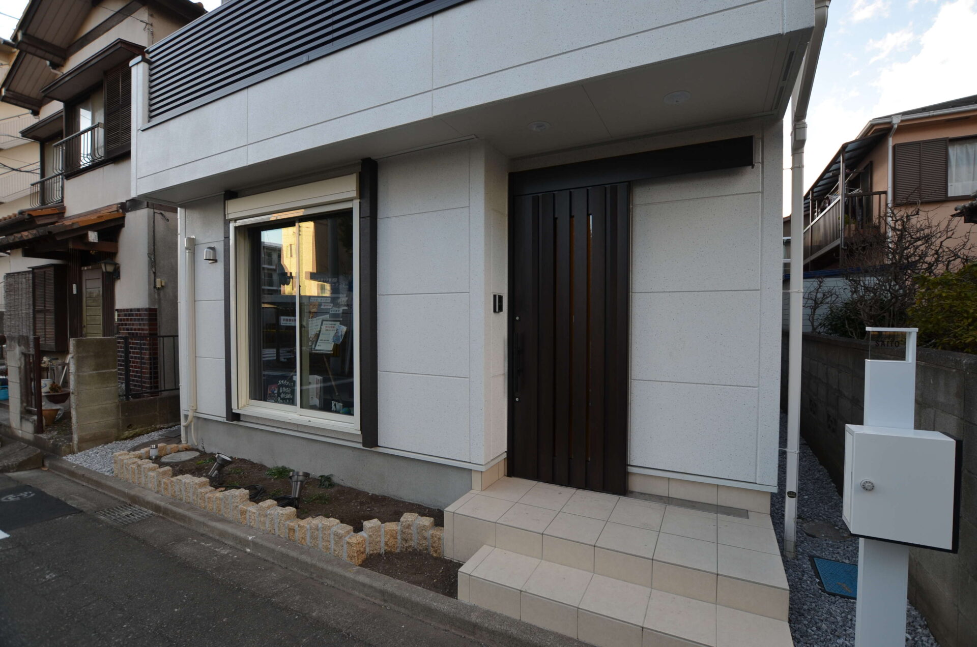 玄関扉の開口部分にかかる幅で、軽やかな縦格子のフェンスを施工させて頂きました。
