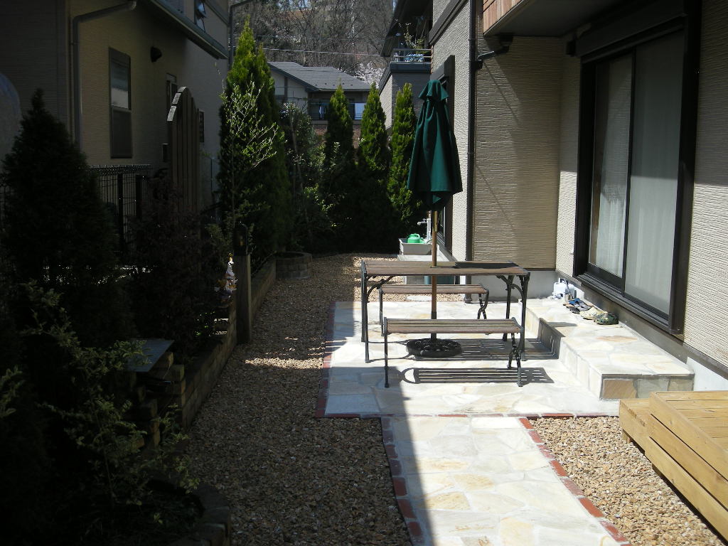 ウッドデッキはソフトウッド(レッドシダー製)で既に危険な状態でした。樹脂製などで再びデッキを作る案も出されたのですが、当初のご使用状況を伺うとあまり活用されていないようでしたので、地面と同じ高さの乱形石のテラスをおすすめしました。ウッドデッキは場所にもよりますが、実際に使って見ると目線が高くなるので一般的な住宅地だと周りの視線が気になって使えないことが多いんですよね。今回のような低いテラスは、目線が低くなるので安心感が高く、おすすめの1つと言えますね。