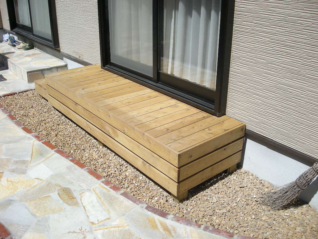 自然乱形石のテラスおよびアプローチをベースに、化粧砂利を施工。出入りに便利なベンチ風のウッドデッキも。