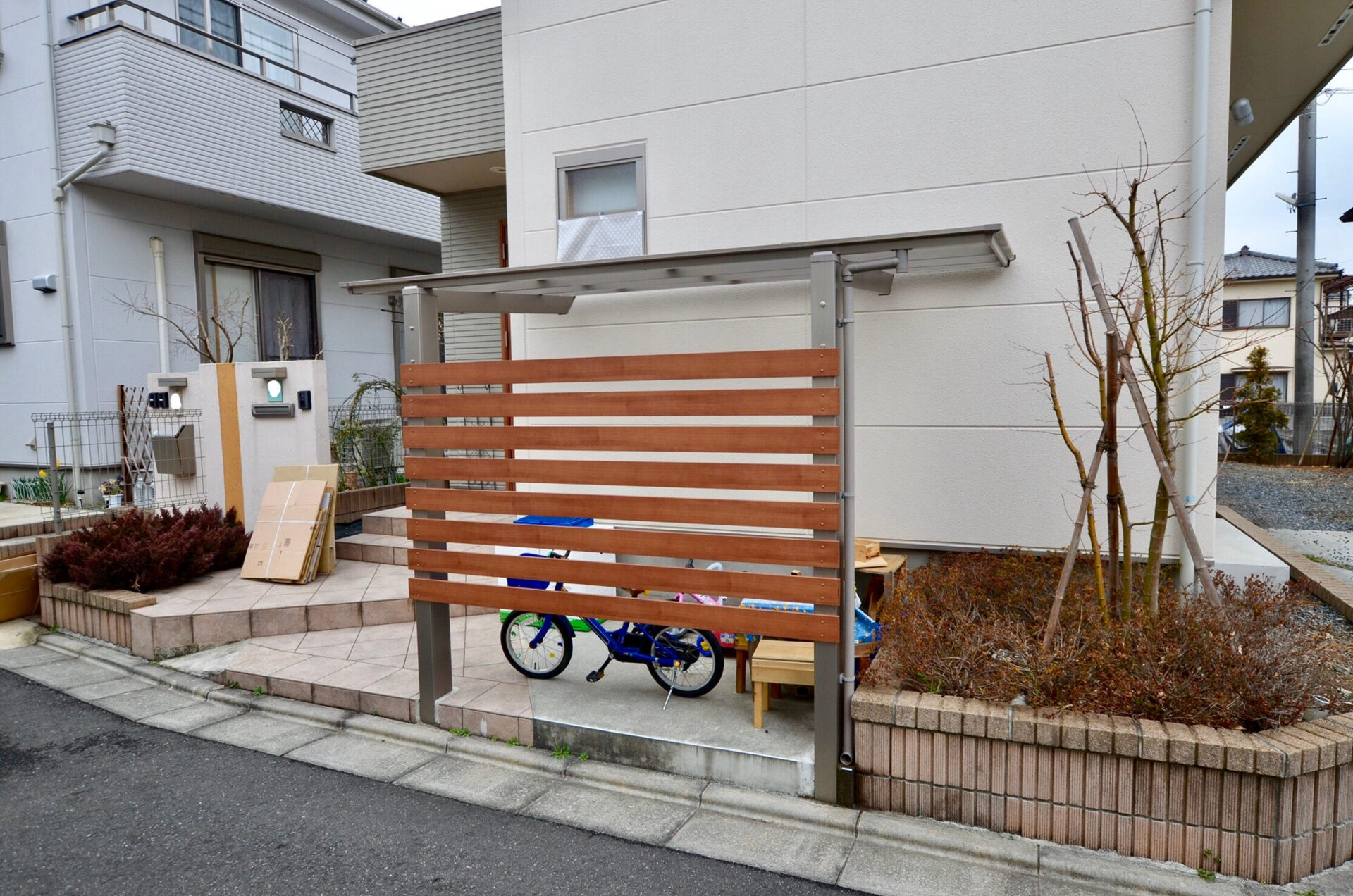 アルミ製サイクルポートを施工させて頂きました。雨風除けと目隠しの為に木目調の横板も飾り付け。