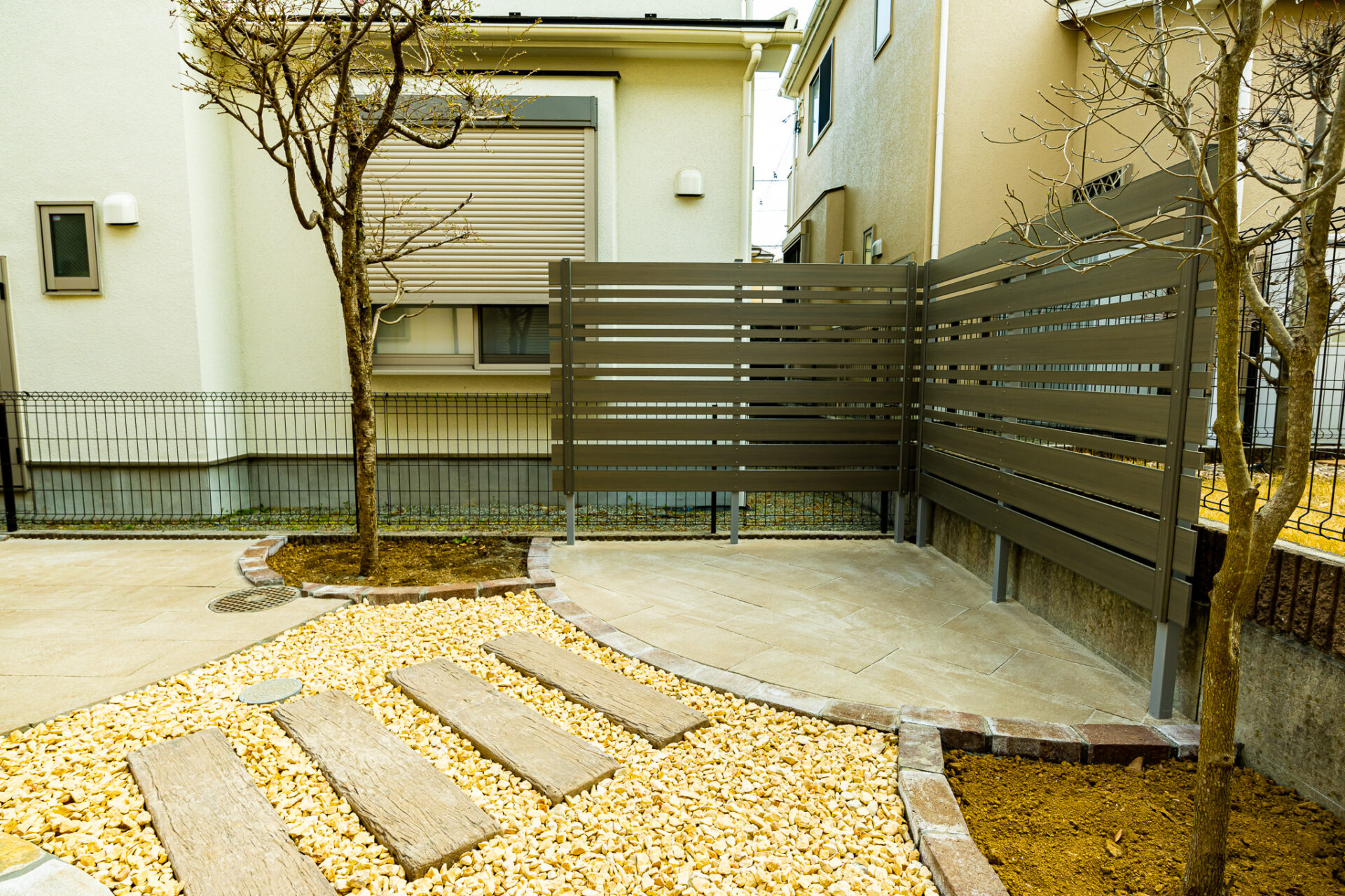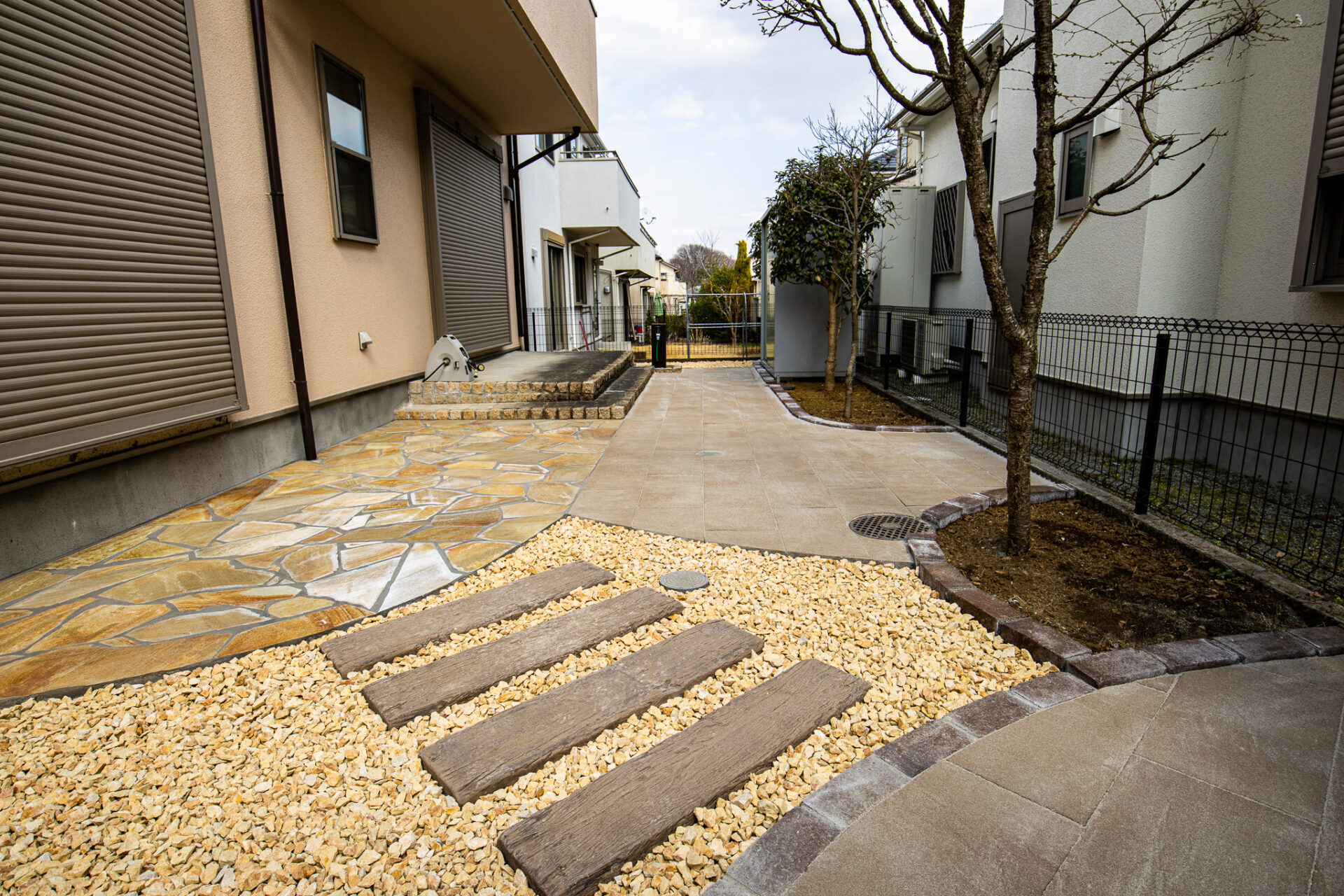 既存物との兼ね合いと、一部庭木の撤去や移植の位置関係やバランスを考え、お好みも伺いながら自然乱形石・石調透水性平板・化粧砂利を組み合わせて全体がつながる形に納めました。