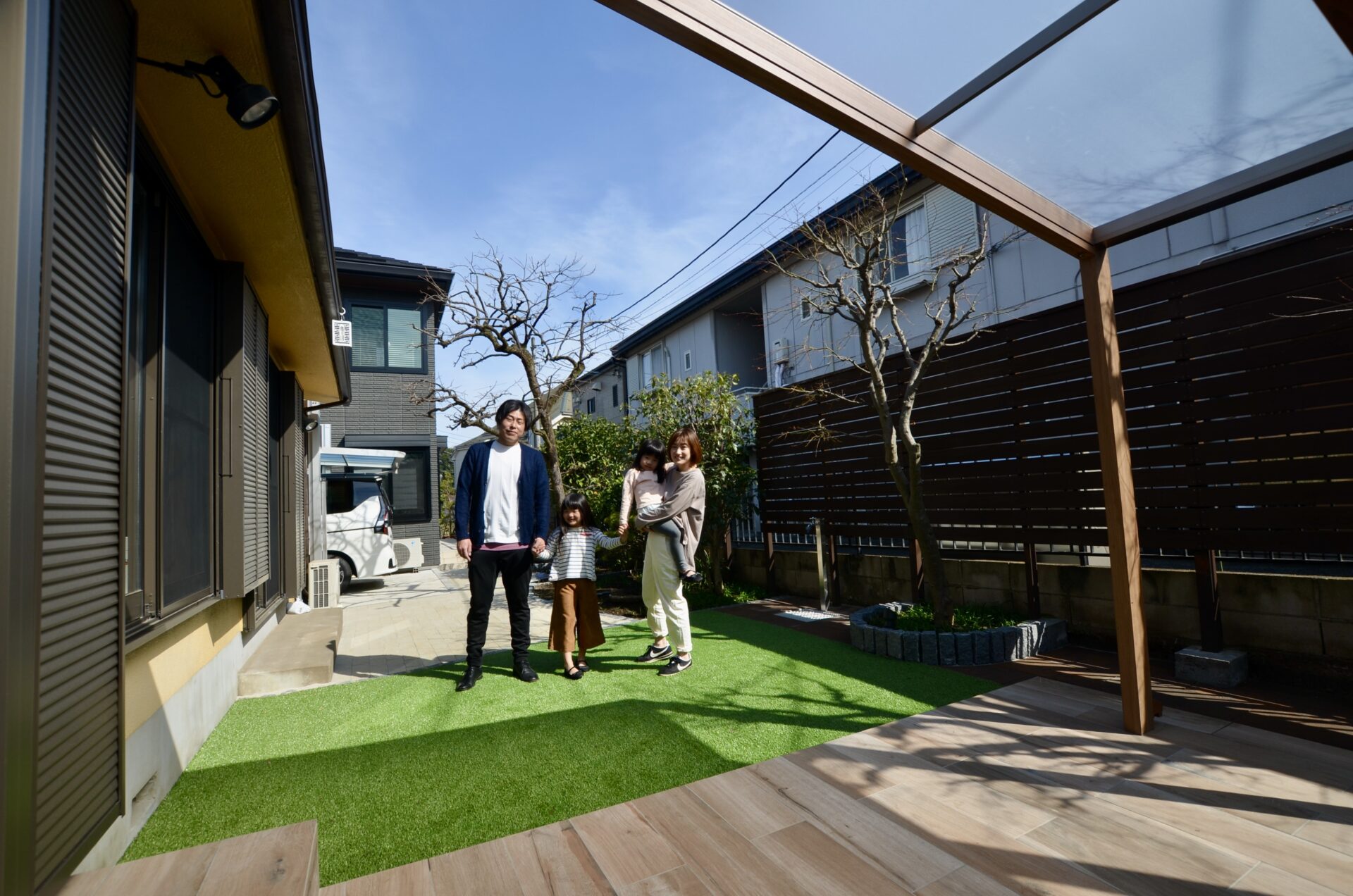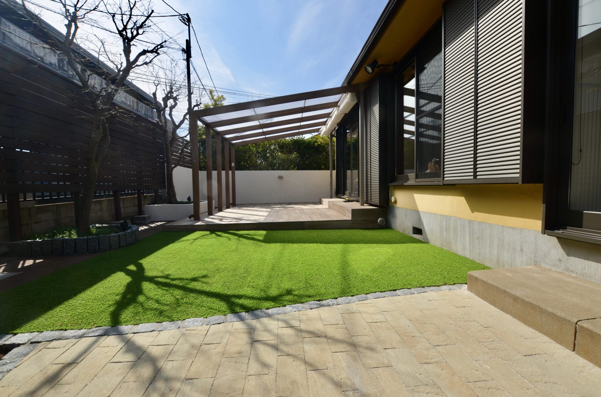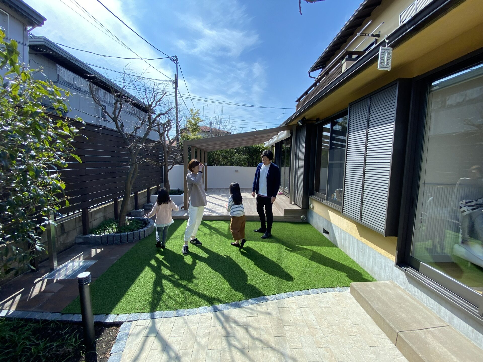 そして2つ目、真ん中のエリアを人工芝に。お子さんたちが寝転んで遊ぶスペースになったり、また駐車スペースと上記のテラスとをつなぐ、カッチリしすぎない素材感と見た目となっています。