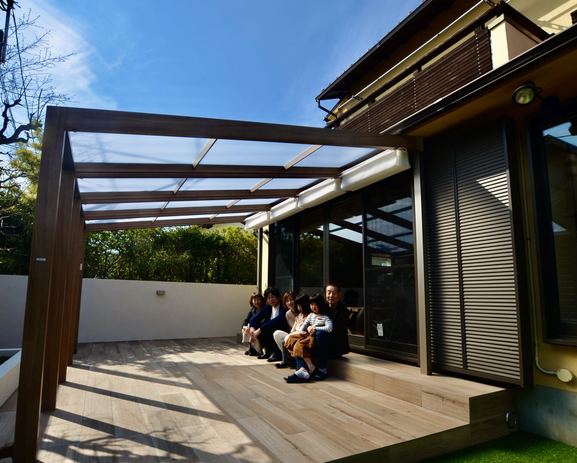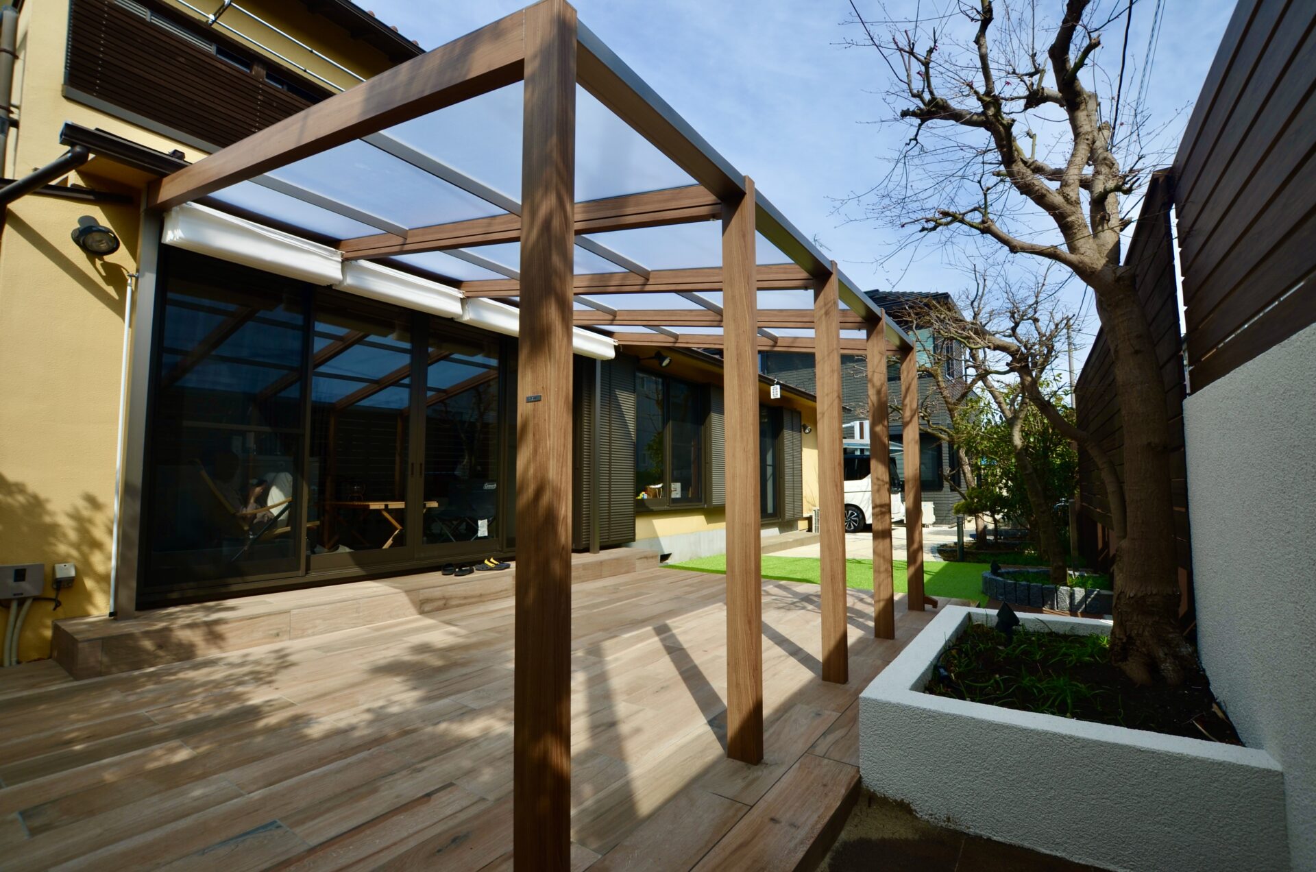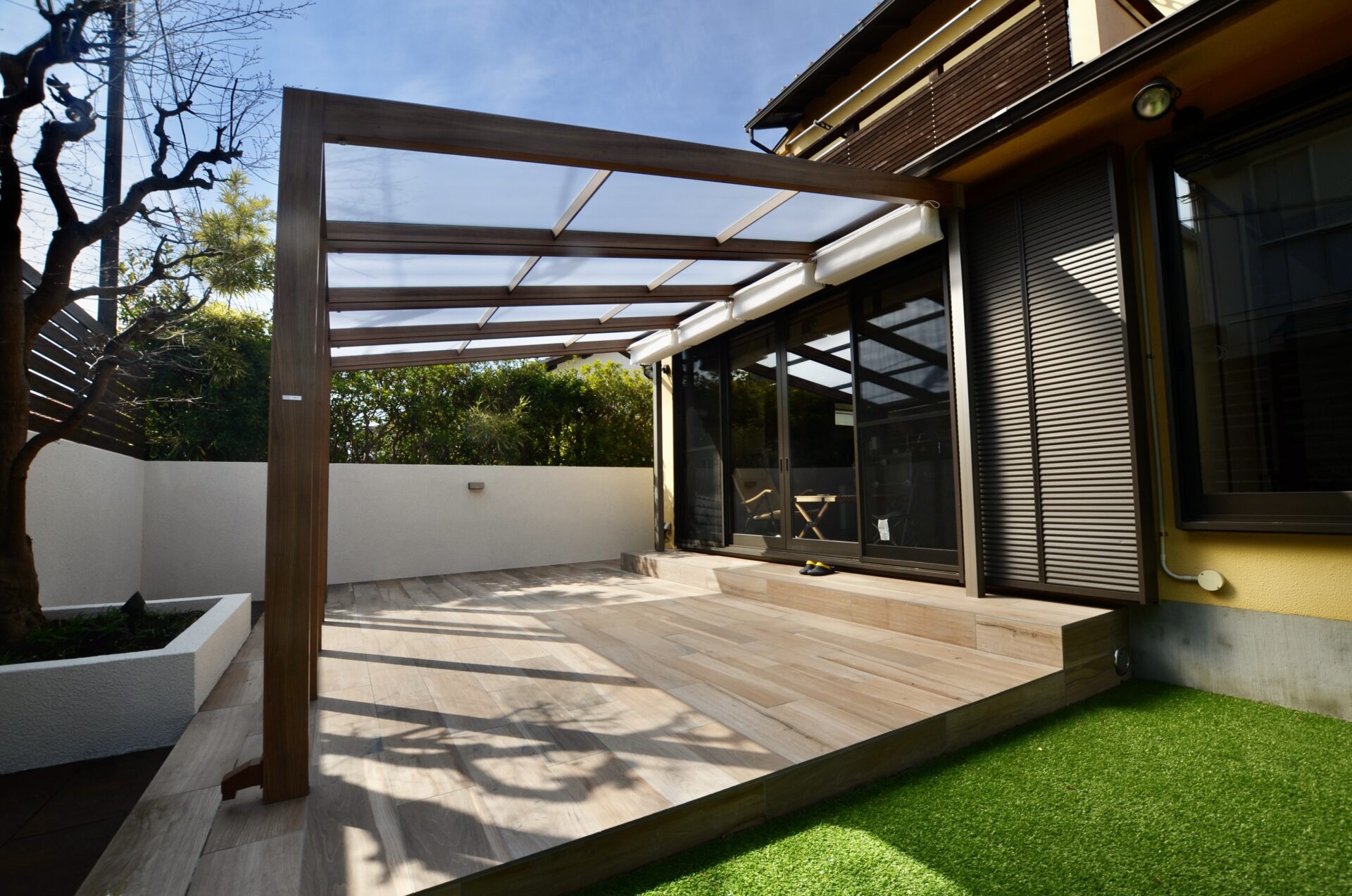 1つ目は、リビング窓前のタイルテラス。木目調で温かみのある大きなテラスは、リビングからの景色が広々と感じられ、またお部屋からお庭へ安全につながる段差解消としても役立っています。