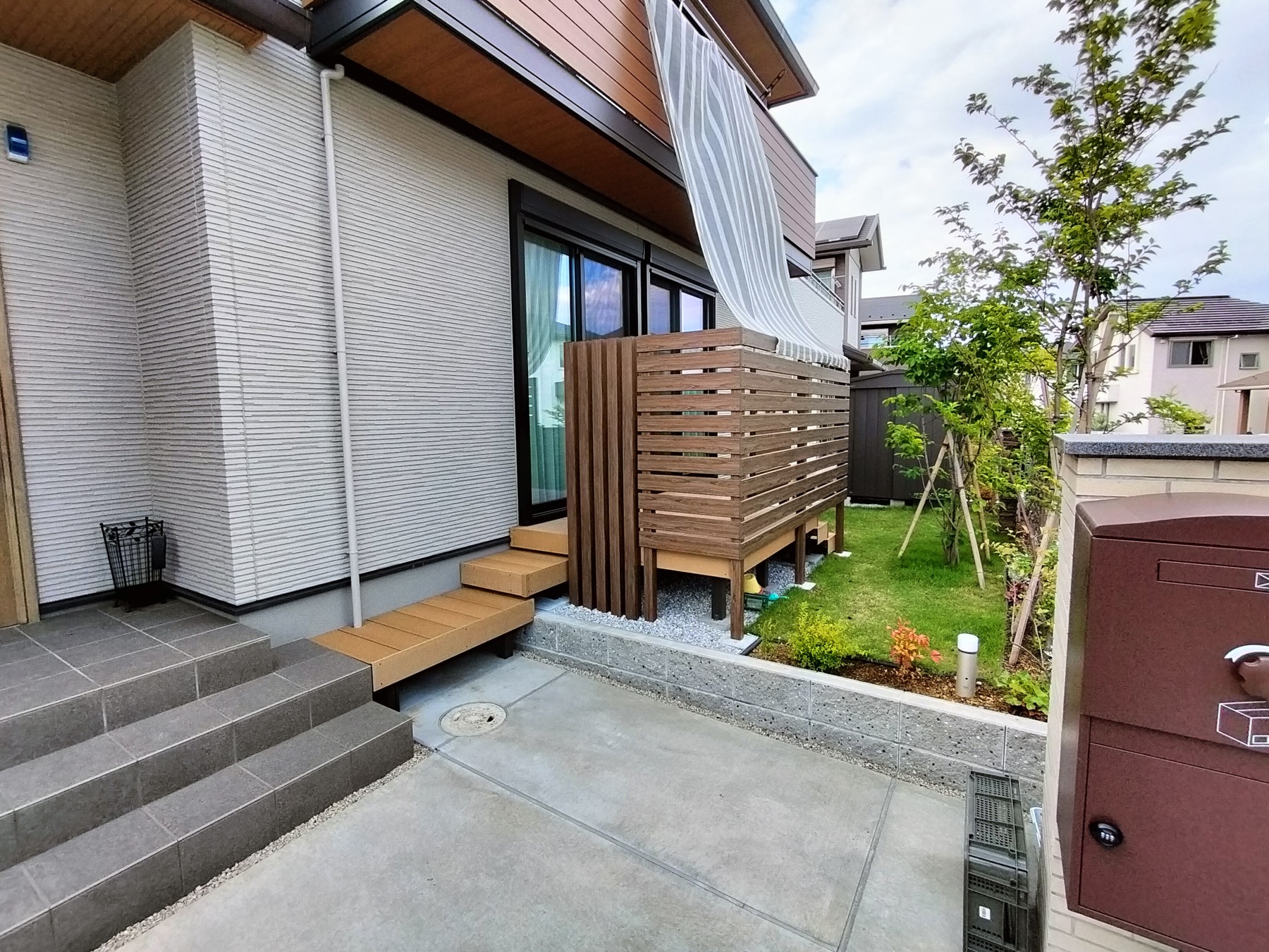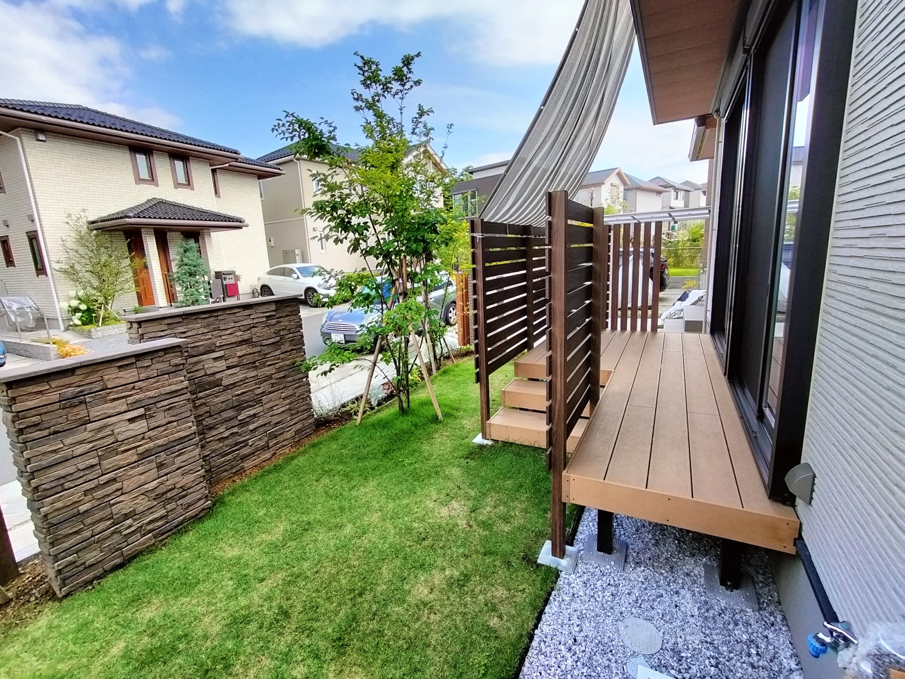 お客様は、ご新築と一緒に作ったウッドデッキや芝生のお庭スペースがお気に入りでしたが、道路から丸見えで使いづらい点にお悩みでした。また、お部屋に居る時も外が気になって、「カーテンが開けられる生活がしたい・・・」と思われていました。