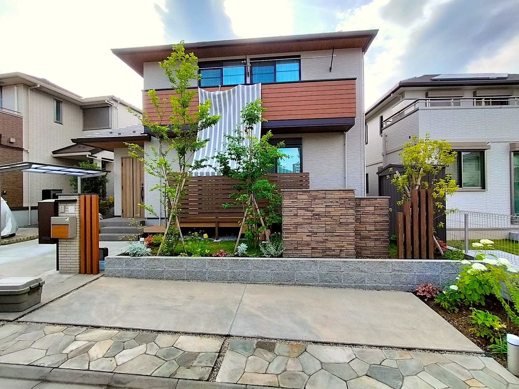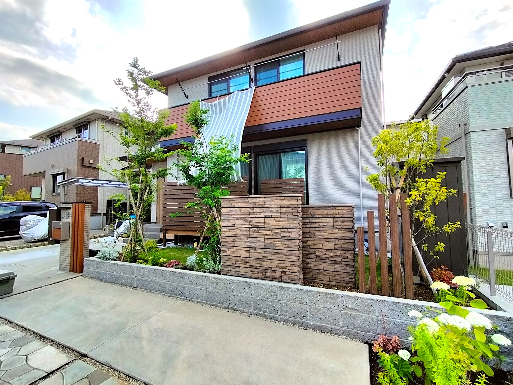 主な内容:目隠しフェンス・角柱(木目調アルミ製:タカショー エバーアートウッド) 石積み調壁 デッキ延長(LIXIL 樹ら楽ステージ) 花壇 サイクルポート(LIXIL フーゴミニ)