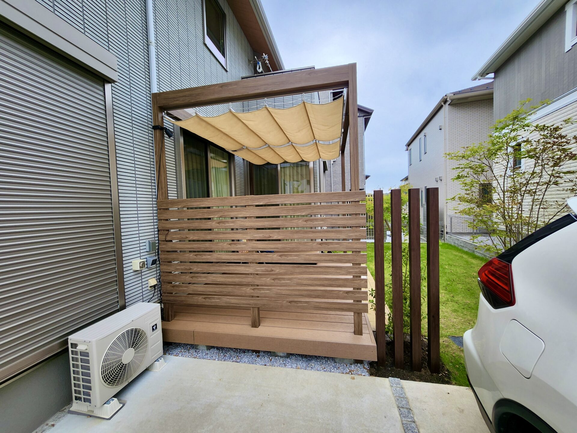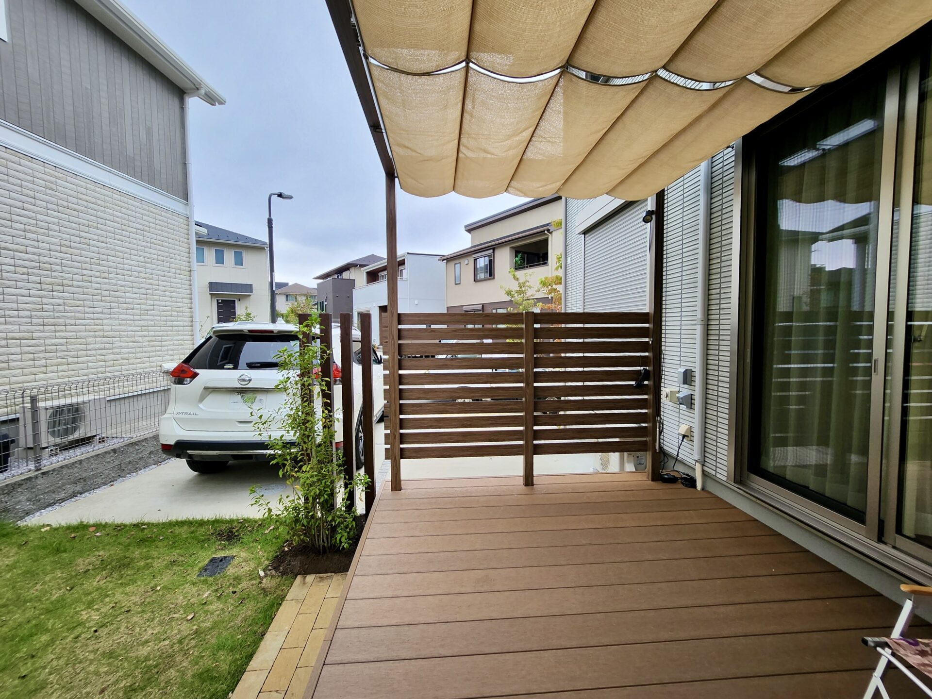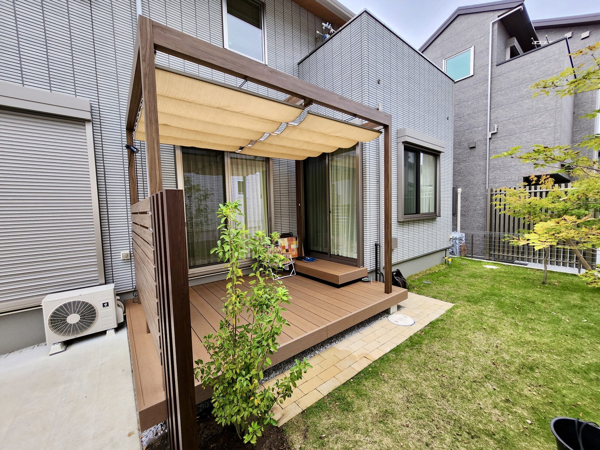 主な内容:樹脂製デッキ(LIXIL樹ら楽ステージ) 日除けパーゴラ・目隠しフェンス・木目調角柱(タカショー エバーアートウッド) 透水性舗装材 植栽